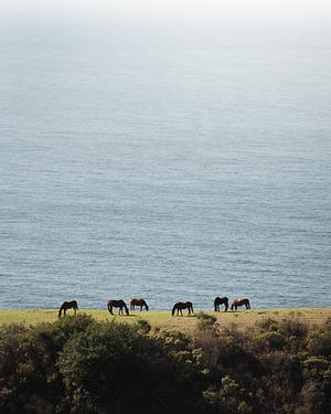 Herd of horses graze on a hillside above the pacific in Big Sur, California.